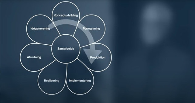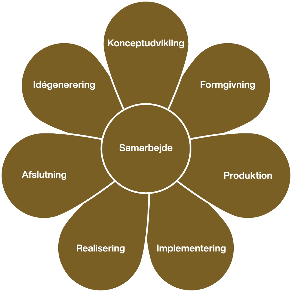 Procesmodellen indeholder syv faser. I midten af modellen er "Samarbejde" placeret, fordi kommunikation og samarbejde er knudepunkt for alle projektets faser.