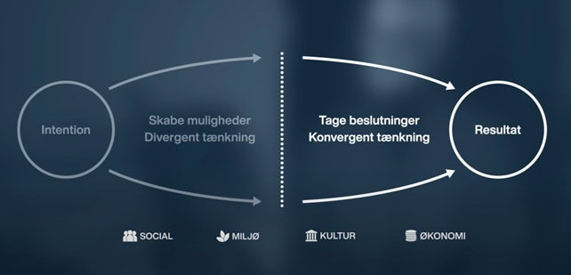 Når vi arbejder med innovation og bruger designtænkning som grundlag for vores projektarbejde, handler det ofte om at skifte mellem to måder at tænker på: divergent og konvergent tænkning. Designkonsulent Lykke Bloch Kjær forklarer dynamikken i designtænkning og den fælles proces mod projektets mål.