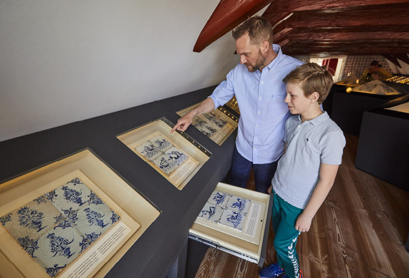 På første sal er der kniplingsudstillinger, slesvigholstenske fajancer og hollandske fliser, der afspejler samhandelen og kulturmødet med landene mod syd.