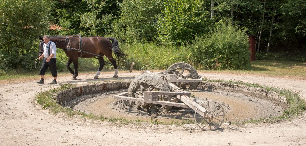 På udendørsområdet kan du se rekonstruktioner af tidligere tiders produktionsformer, hvor æltemøllen blev trukket af heste, formning af mursten foregik med håndkraft, og stenene blev brændt i en mileovn